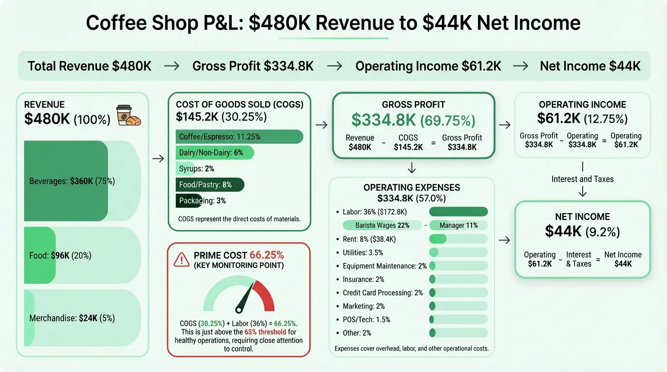 Coffee drinks have the best COGS of almost any food service product — a $5.50 latte typically costs $0.80–$1.10 in ingredients. Yet the average independent coffee shop earns a net margin of 10–18%, not the 70–75% the ingredient math might suggest. The gap between that beverage gross margin and the bottom line is the income statement story: labor, rent, and operating expenses that consume what the espresso machine produces.