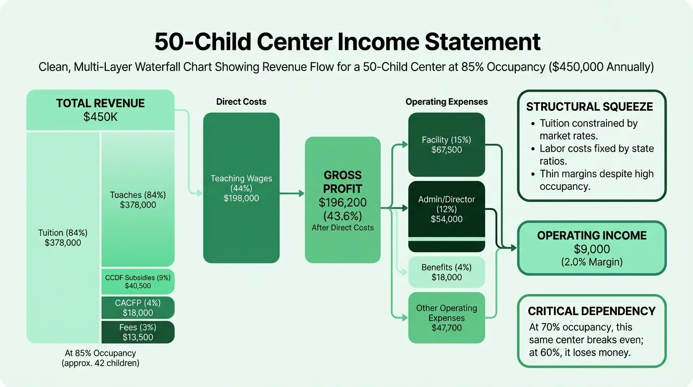 This matches the thin-margin reality documented across multiple industry sources. The Federal Reserve Bank of Minneapolis has found that margins under 1% are common for independent centers; the 2% here reflects active CACFP participation and good occupancy. A center running at 70% occupancy instead of 85% on the same fixed cost structure would be at breakeven or operating at a loss.