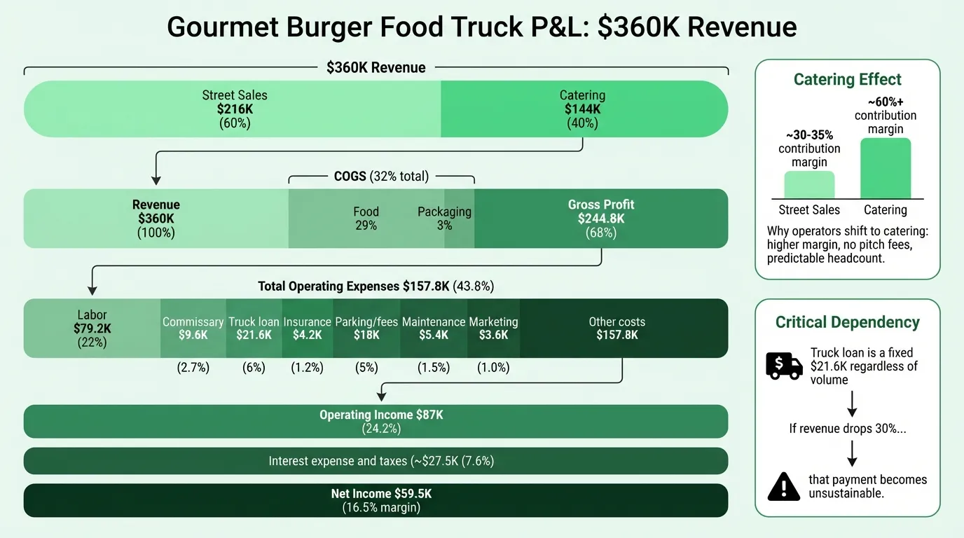 Here's a realistic annual income statement for an owner-operated gourmet burger food truck at $360,000 in annual revenue — slightly above average, reflecting a well-established route with growing catering business: