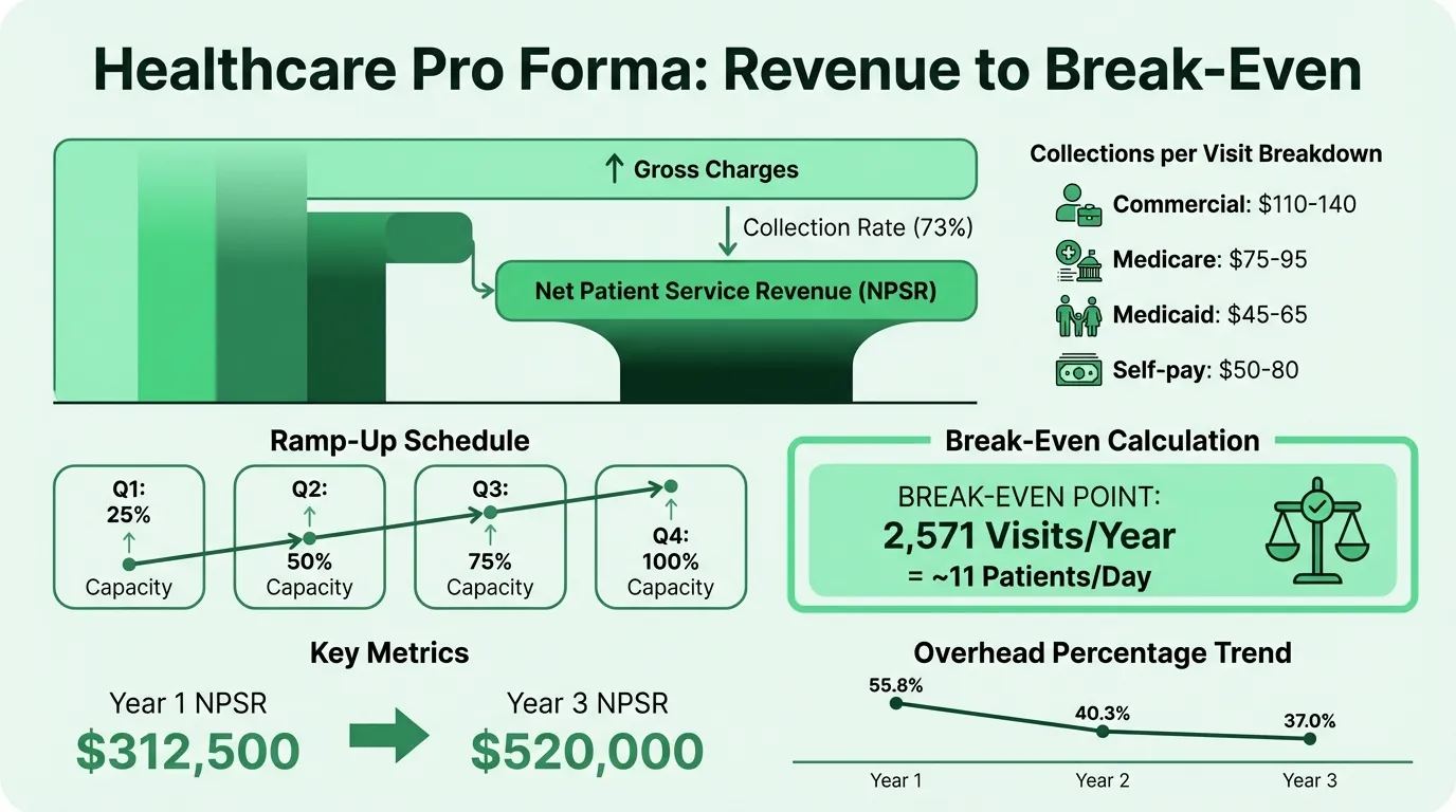 Gross charges vs. net collections. You bill the gross charge. Payers have negotiated contractual adjustments that reduce it. After adjustments, some claims are denied outright. What you actually collect — net patient service revenue — might be 55–85% of what you billed. A pro forma built on gross charges without a realistic collection rate is not a financial model; it's an optimistic number. For a detailed look at how these adjustments flow through a real P&L, see our healthcare income statement example.