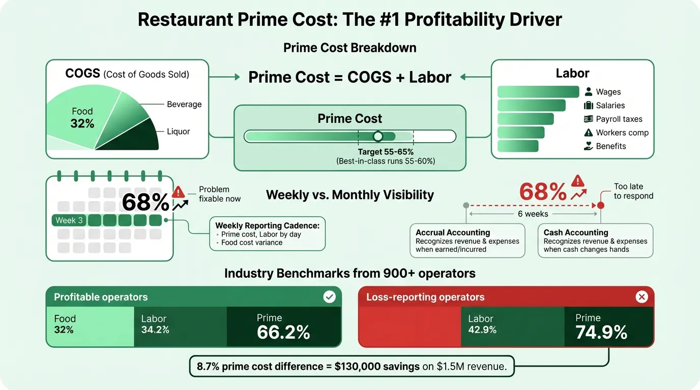 Most restaurant owners check prime cost monthly. By the time a monthly P&L surfaces the problem, you've already paid the costs. The operators who manage prime cost well check it weekly — every Friday or Monday, looking at last week's numbers. A week where prime cost runs at 68% is fixable. Six weeks of 68% before you notice it is a margin hole that's hard to dig out of.