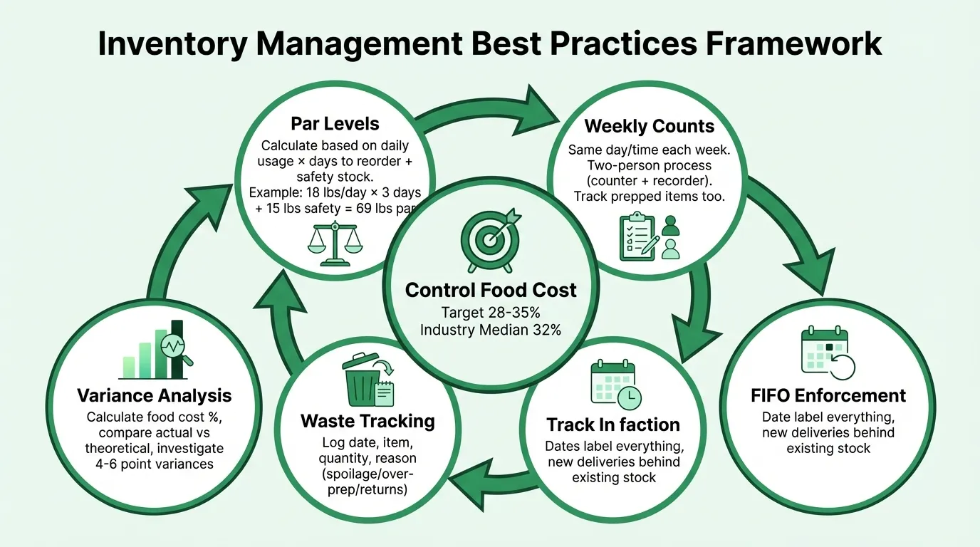 Practical restaurant inventory management best practices — covering par levels, FIFO, weekly counts, waste tracking, and how to use the data to control food cost.