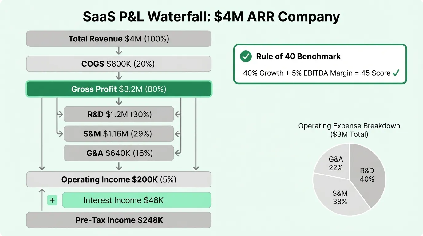 Here's a realistic annual income statement for a B2B SaaS company at $4M ARR, growing 40% year-over-year: