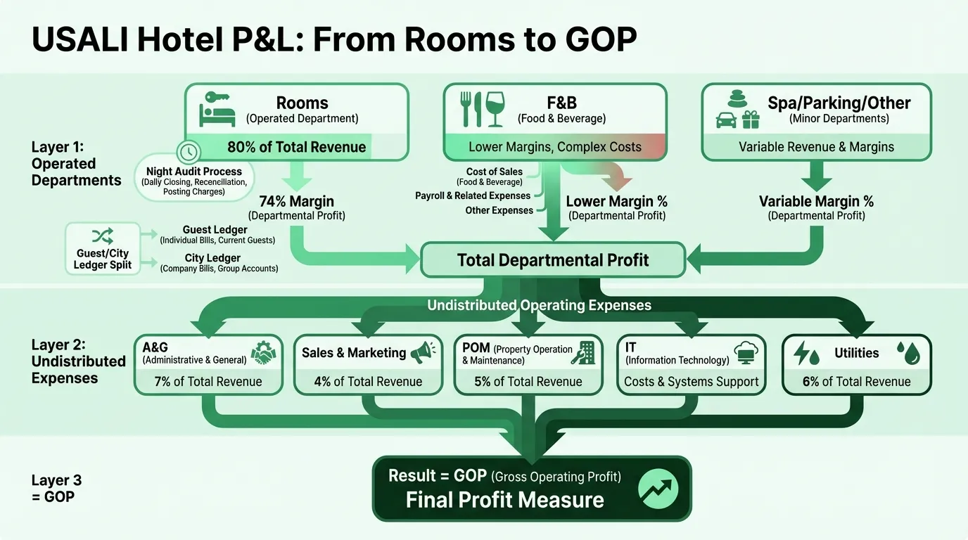 The USALI P&L has a specific architecture that differs from a standard business income statement. It flows in three layers: