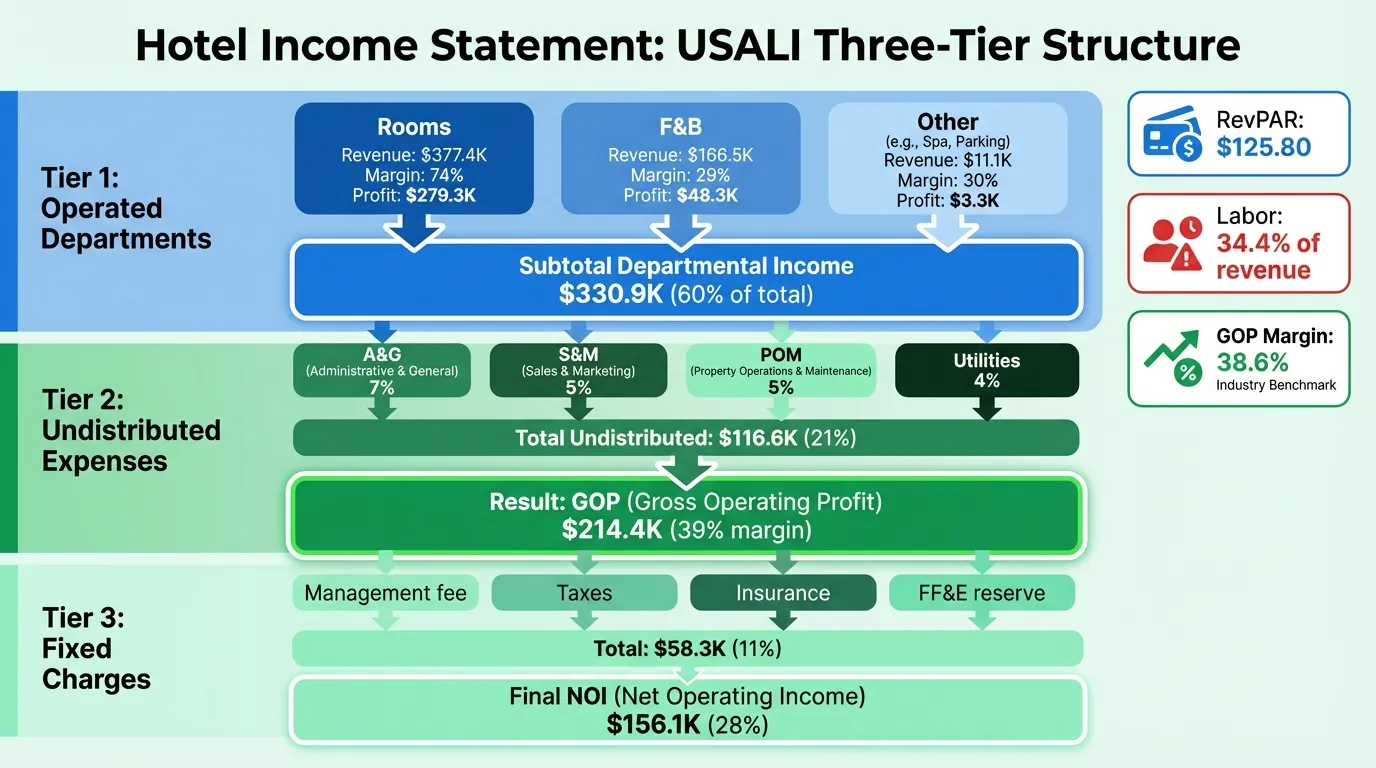 Hotels follow the Uniform System of Accounts for the Lodging Industry (USALI) — a standardized accounting format that's been the industry standard since 1926. USALI divides the P&L into three tiers, each with a different purpose.