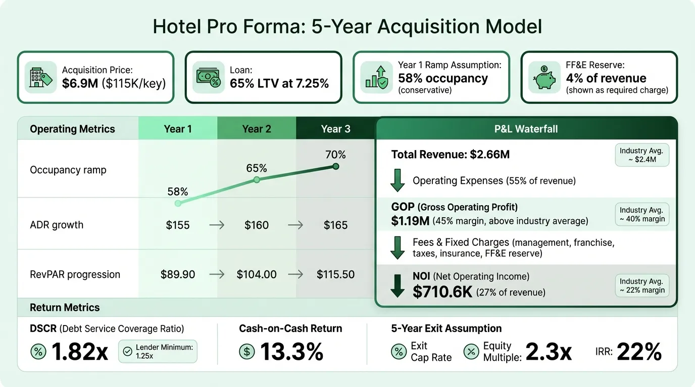 This model assumes a stabilizing secondary-market hotel — year 1 is below stabilized occupancy, with ramp to full performance by year 3.