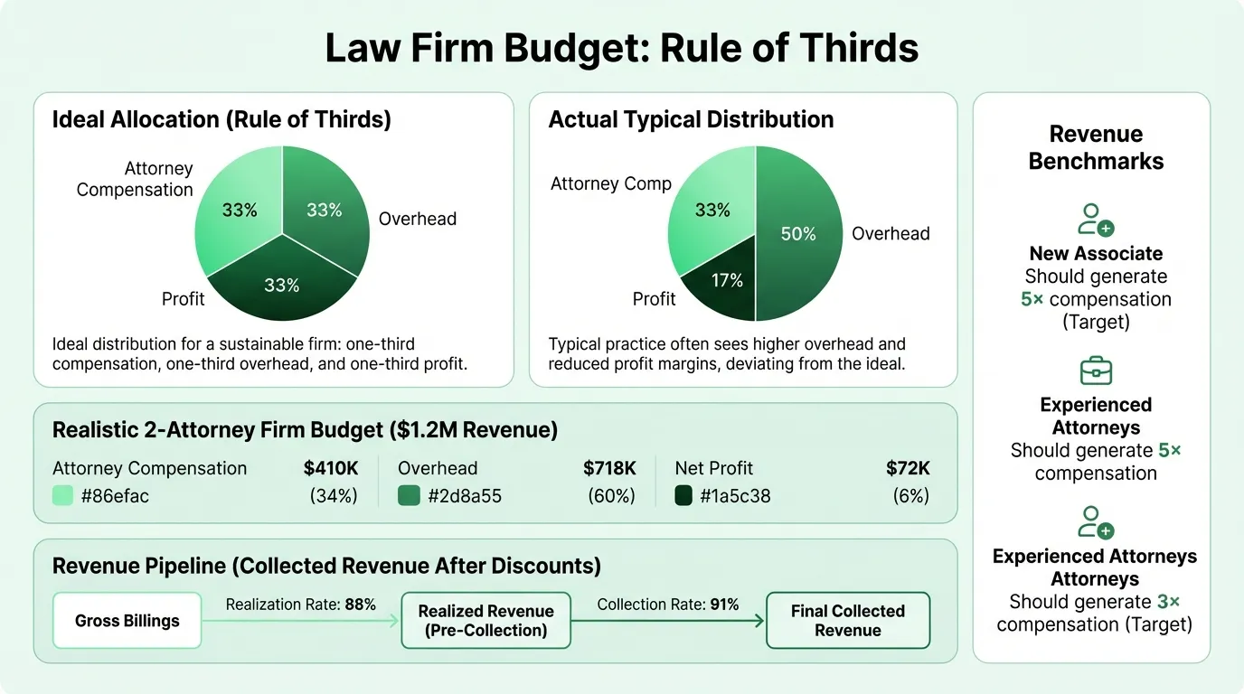 When building your budget, project billable hours conservatively. If an attorney works 200 days and targets 5 billable hours per day, that's 1,000 billable hours. At $300/hour, gross billings are $300,000. Apply an 88% realization rate and 91% collection rate, and collected revenue is roughly $240,000 — not $300,000. For a deeper look at how these efficiency metrics drive profitability, see our law firm accounting guide.