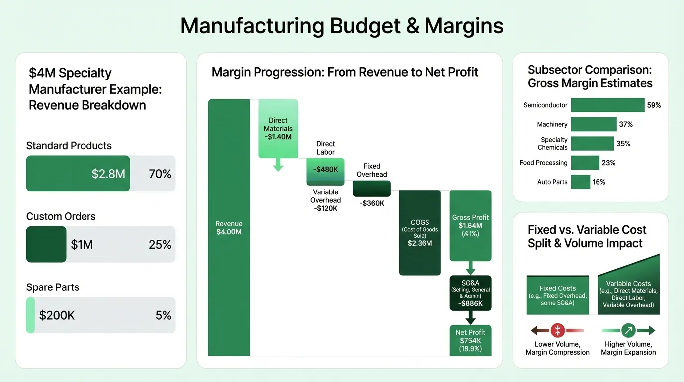 A practical manufacturing budget example covering direct materials, labor, overhead benchmarks, and the gross margin ranges that vary widely by subsector.