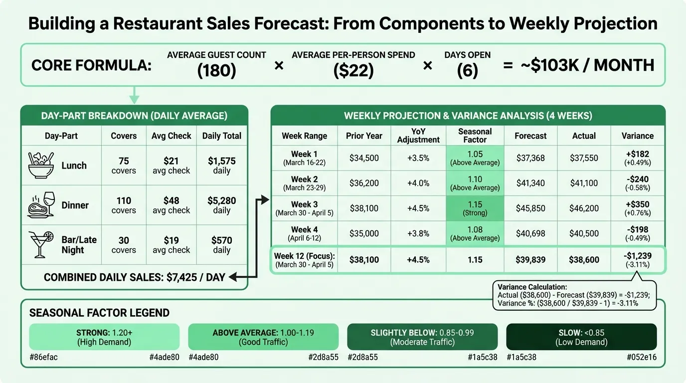 How to build a restaurant sales forecast — covering the core formula, day-part analysis, seasonality adjustments, and how the forecast connects to every other financial decision.