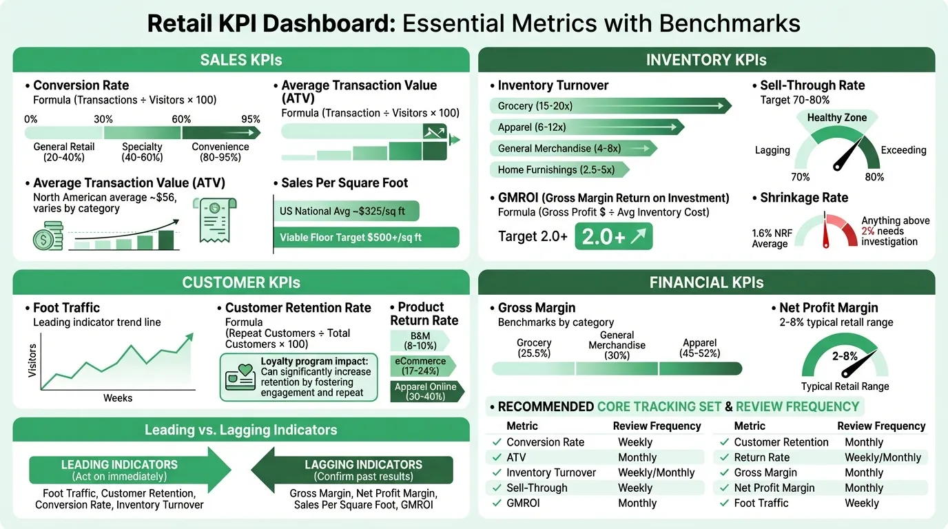Most retail operators find that 8–12 metrics, reviewed consistently, are more useful than 30 metrics reviewed sporadically.