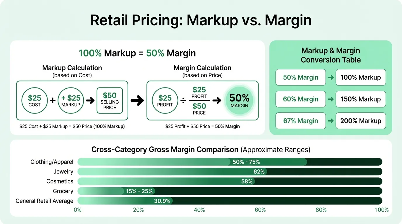 Before anything else, get this math right. Markup and gross margin are not the same number, and confusing them is one of the most common and costly mistakes in retail.