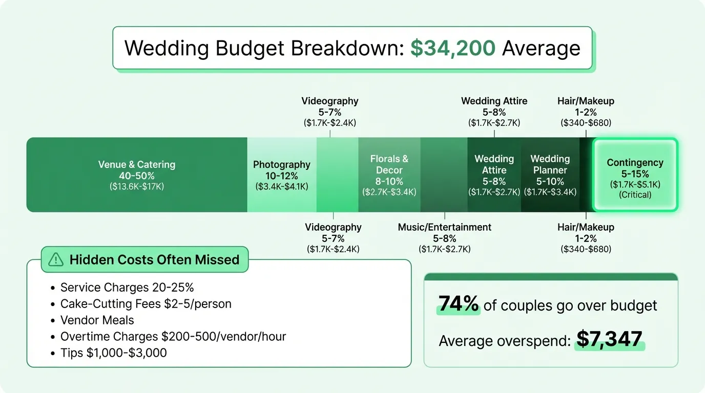 The contingency line isn't optional. 74% of couples overspend — the ones who budget a buffer absorb the overruns without crisis. The ones who don't have to scramble when the floral quote comes in $800 higher than expected.
